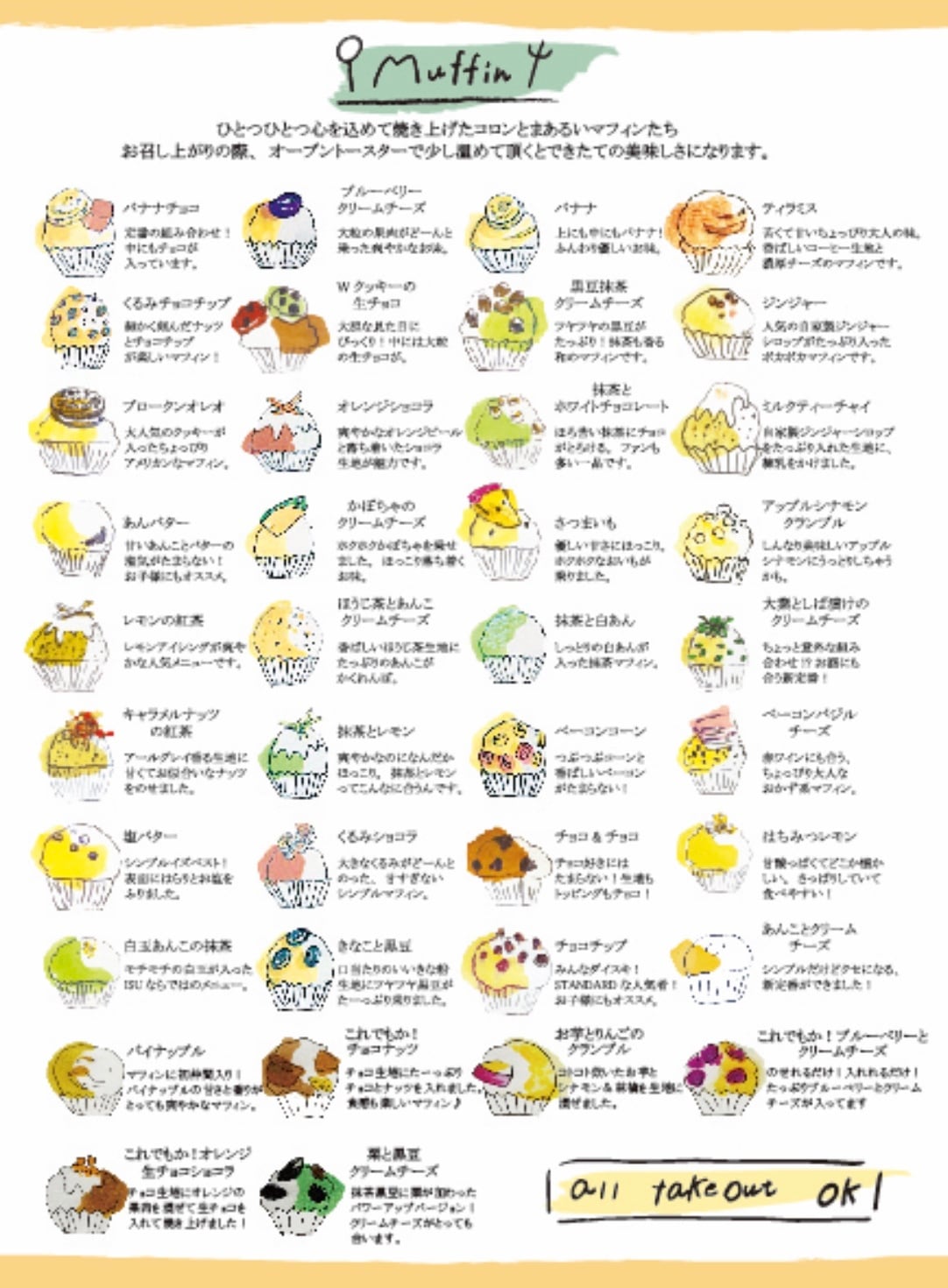 小麦粉、バター、牛乳、卵、砂糖、チョコレート、ココア、抹茶、ホワイトチョコレート、塩、小豆あん、白あん、ココアクッキー、さつまいも、かぼちゃ、ごま、アーモンド、くるみ、マシュマロ、白玉団子、バナナ、クリームチーズ、しば漬け、大葉、ブルーベリー、苺、生姜、はちみつ、栗、ラズベリー、ココナッツ、りんご、ツナ、マヨネーズ、コーン、ナチュラルチーズ、黒豆、レモン、オレンジ、紅茶、ほうじ茶、コーヒー、レーズン、ラム酒、クランベリー、バジル、ベーコン、きなこ、シナモン、/ベーキングパウダー、香料、乳化剤