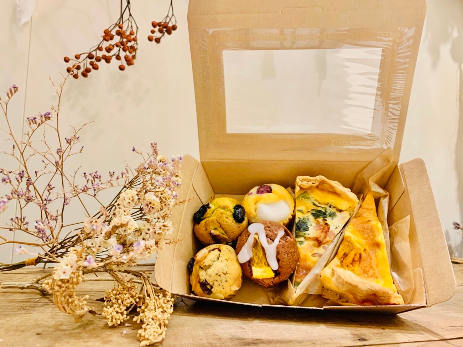 おすすめのマフィン(個包装なし)を4つとプルプルのキッシュを2つをセットにしています。