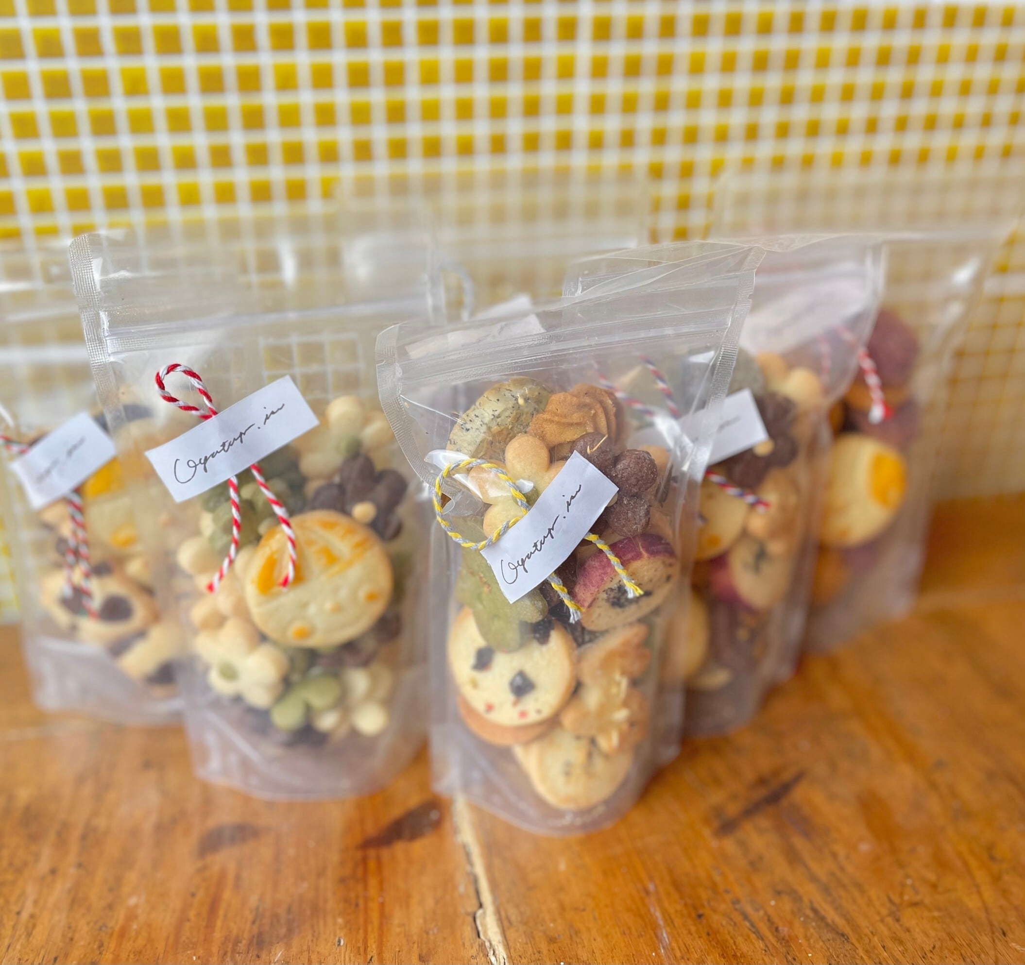 小麦粉、バター、砂糖、卵、ココア、抹茶、紅茶、ほうじ茶、コーヒー、バジル、アーモンド、くるみ、カシューナッツ、ピスタチオ、マカダミア、りんご、レモン、オレンジ、パイナップル、レーズン、バナナ、栗、ブルーベリー、クランベリー、ほうれん草、生姜、サラミ、チョコレート、ホワイトチョコレート、酒粕、味噌、白味噌、はちみつ、ナチュラルチーズ、柚子ジャム、甘納豆、しば漬け、黒こしょう、ピンクペッパー、ローズマリー、ピーナッツバター、黒蜜、クミンシード、苺パウダー、さつまいもパウダー、パンプキンパウダー、シナモン、きなこ、キャラメルシロップ、大葉、青のり、ごま、唐辛子、山椒、醤油、塩 / 加工でん紛、ソルビトール、カゼインNa、調味料(アミノ酸等)、㏗調整剤、リン酸塩、酸化防止剤(ビタミンC)、カラメル色素、発色剤、